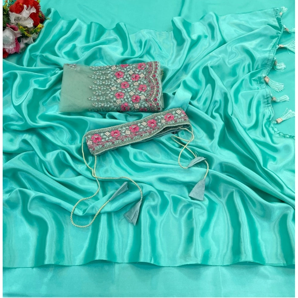 Generic Women's Satin Solid Saree With Unstitched Blouse (Skyblue, 5-5 Mtrs)